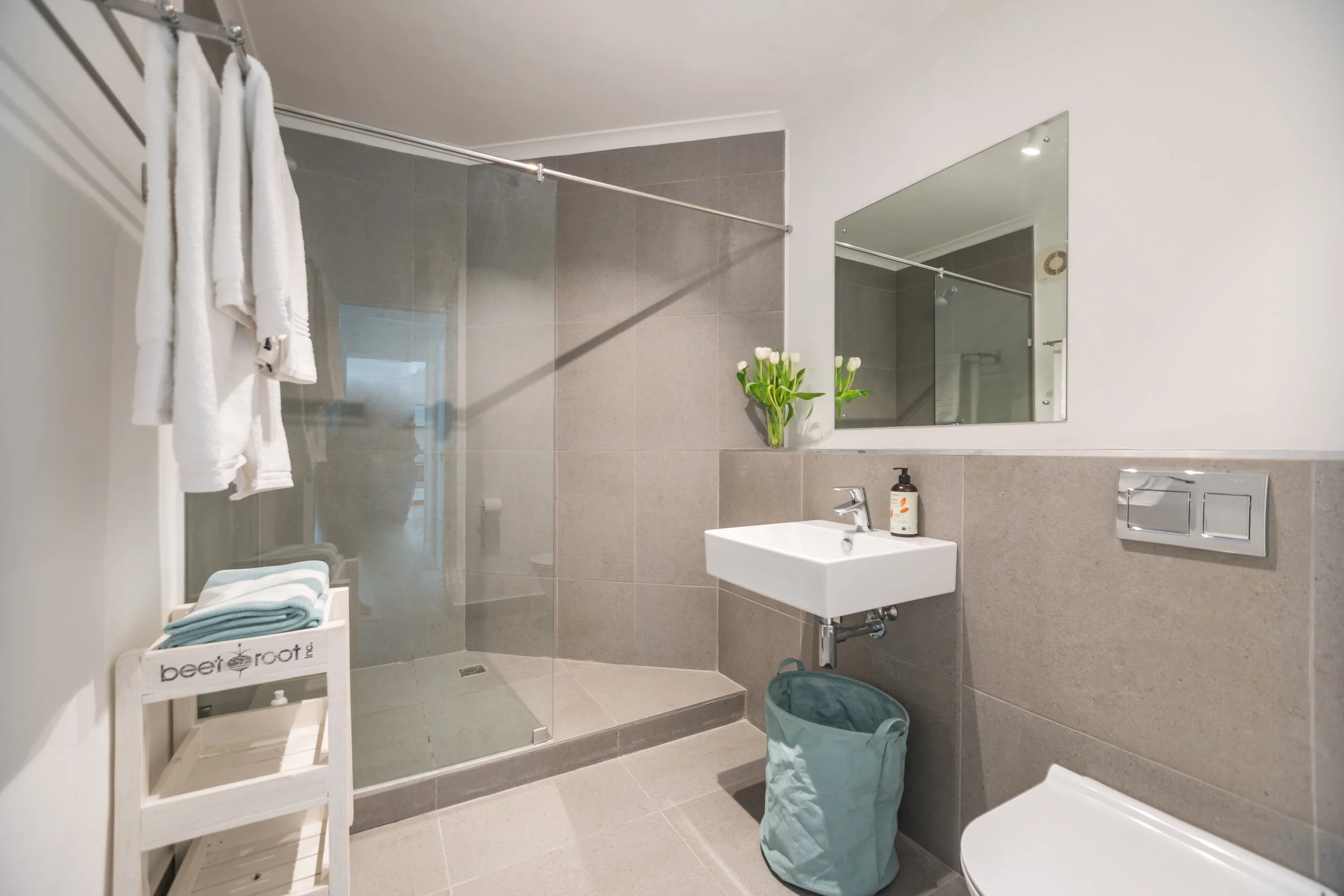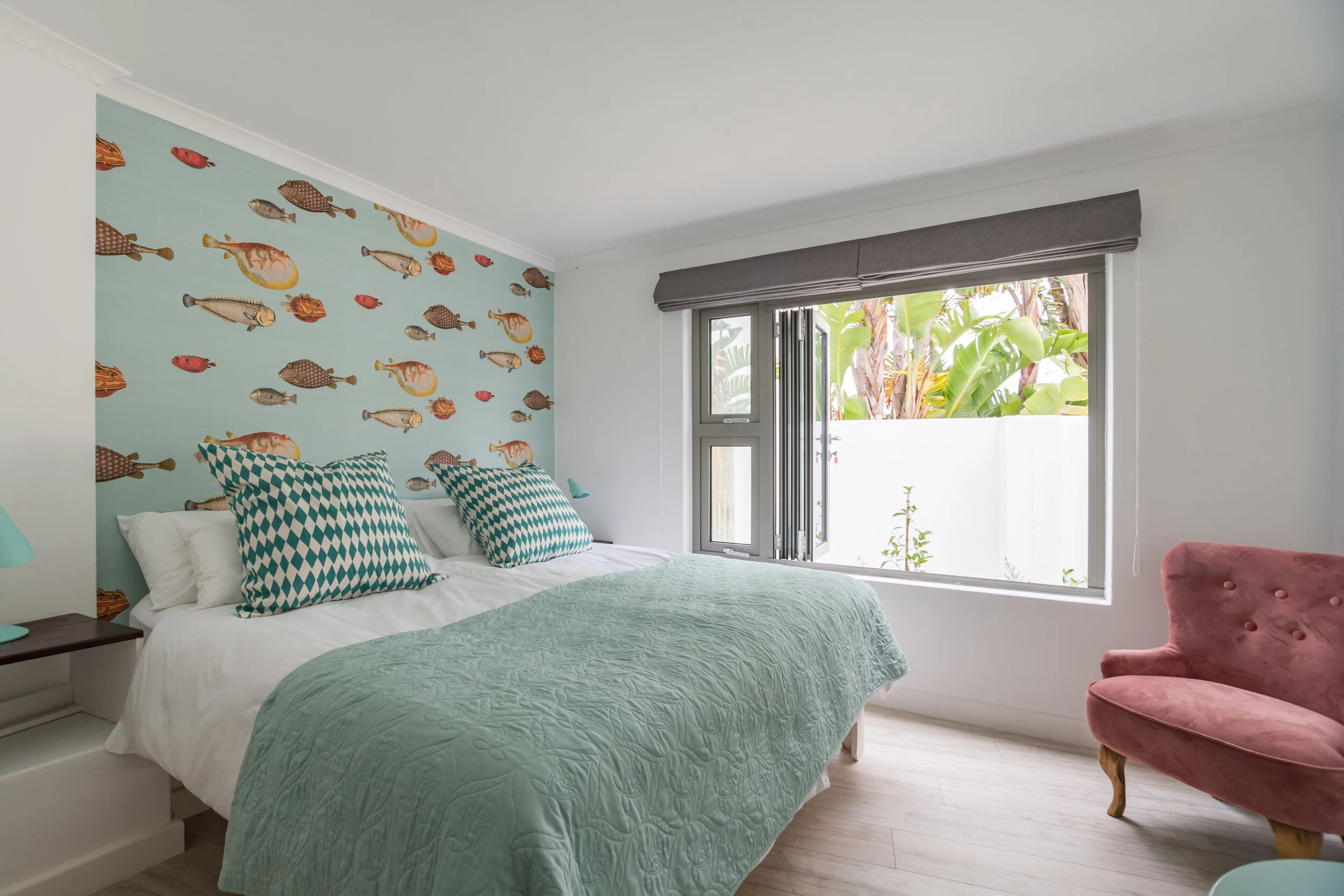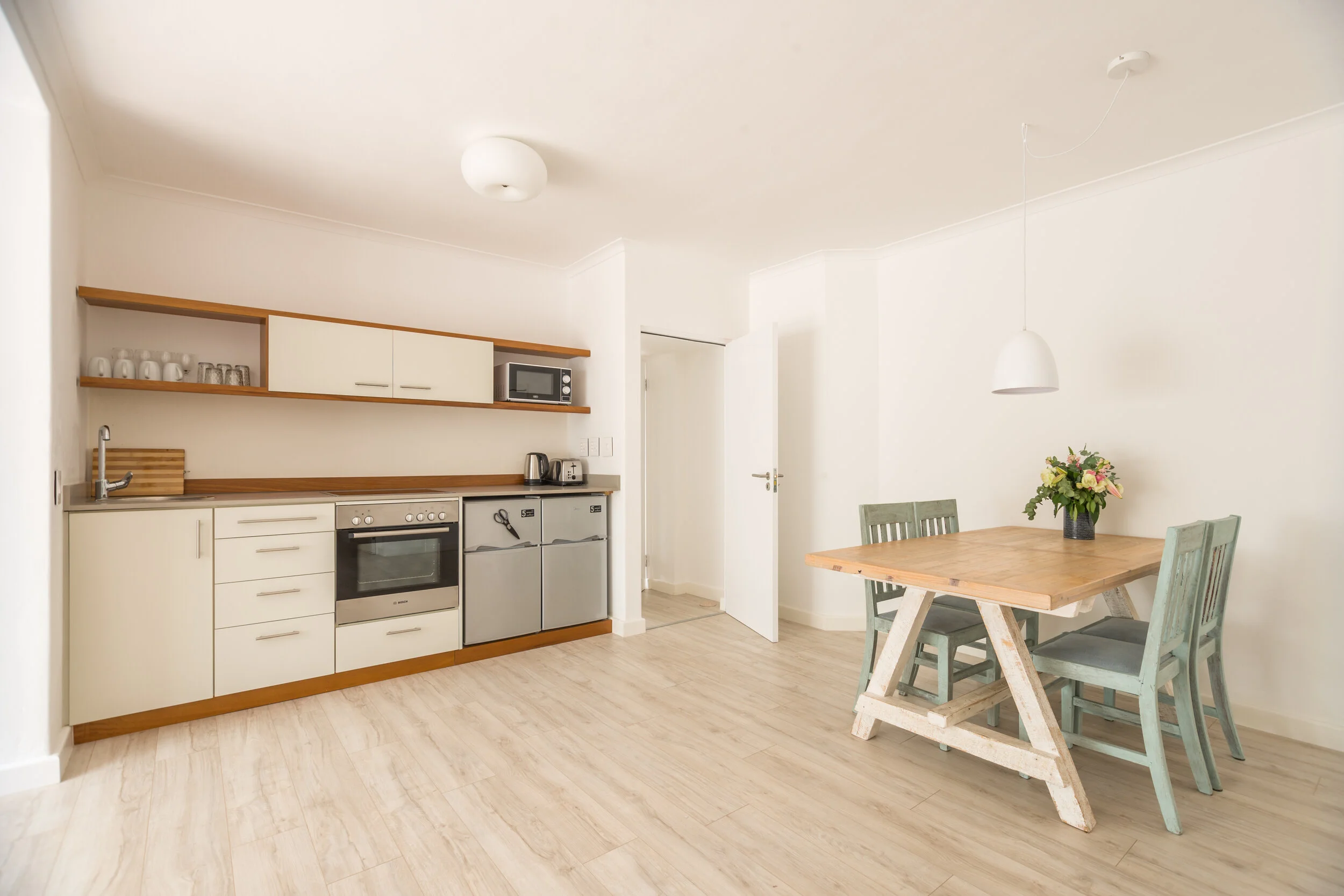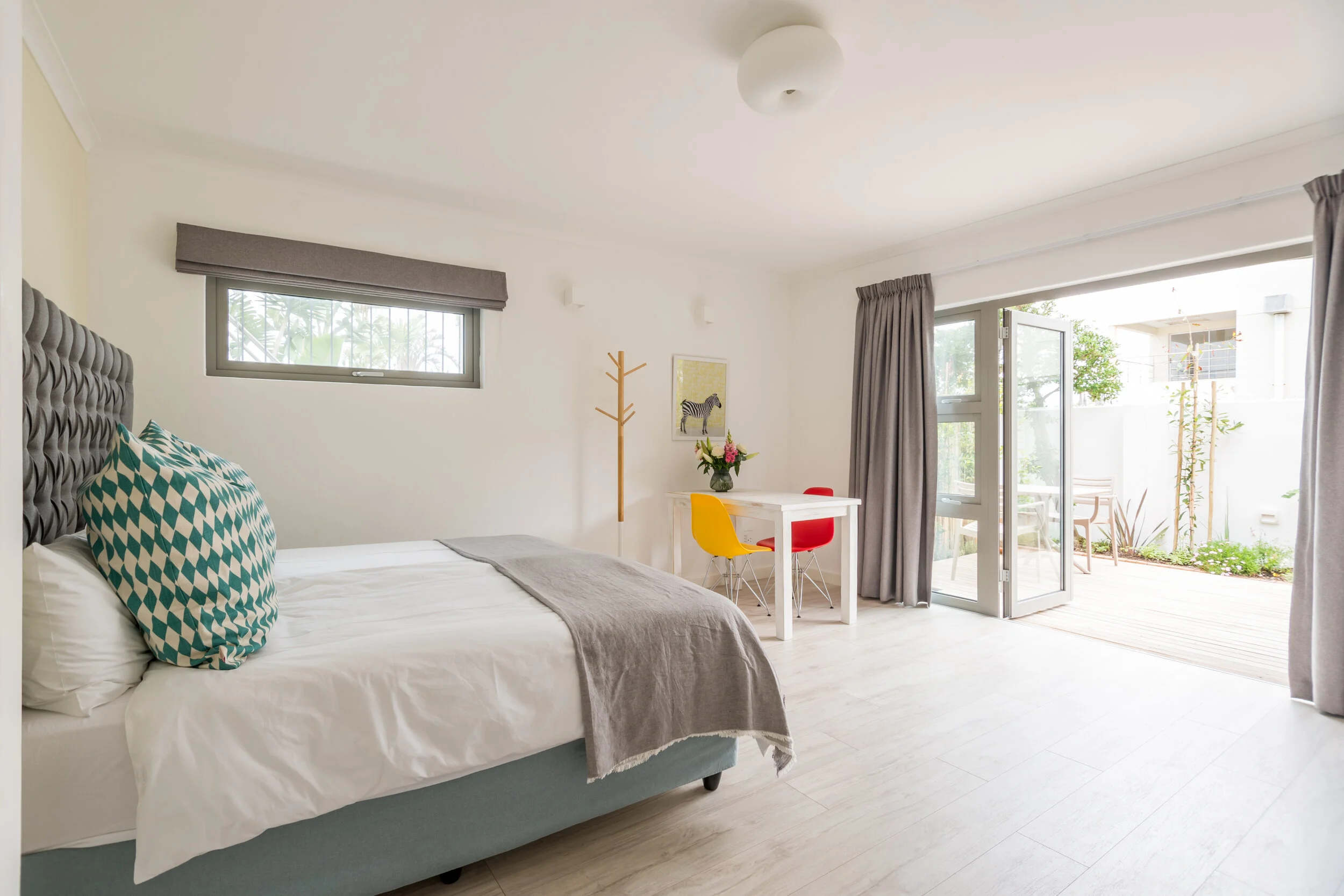 50 sqm, self-catering two room-apartment, designed for 2-3 persons, wooden deck terrace with partial view of Table Mountain and ocean, living room with fully equipped kitchen, bedroom with one kingsize bed, ensuite bathroom.