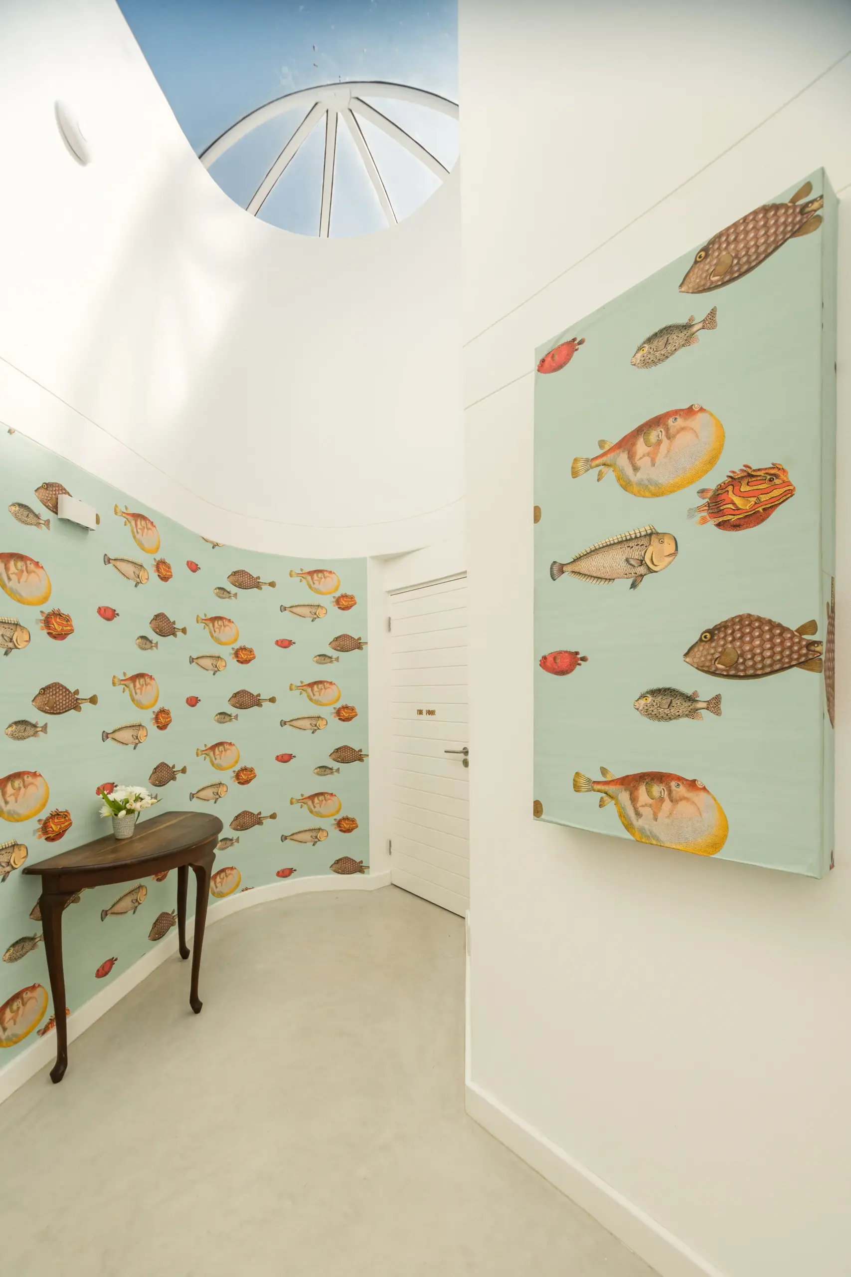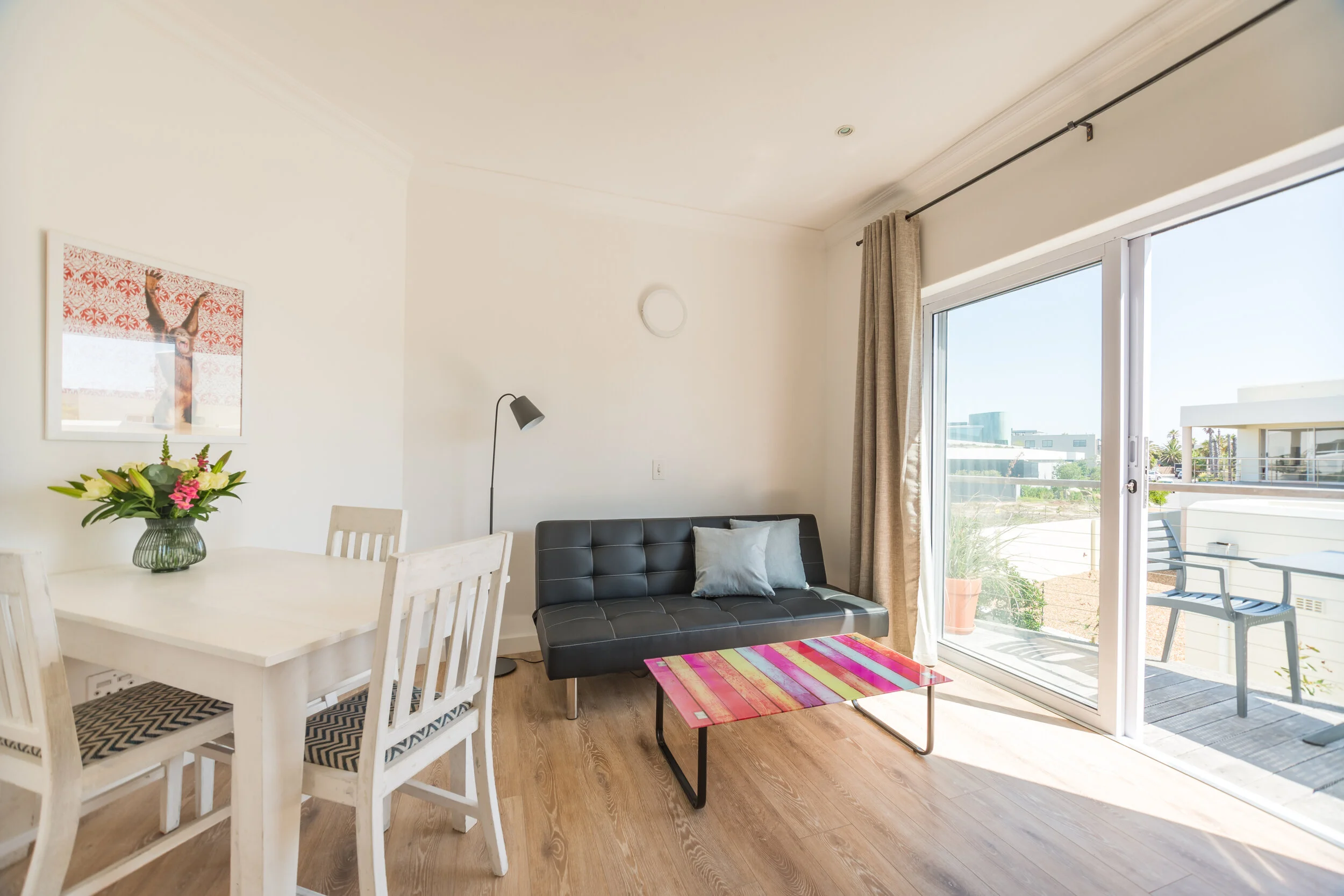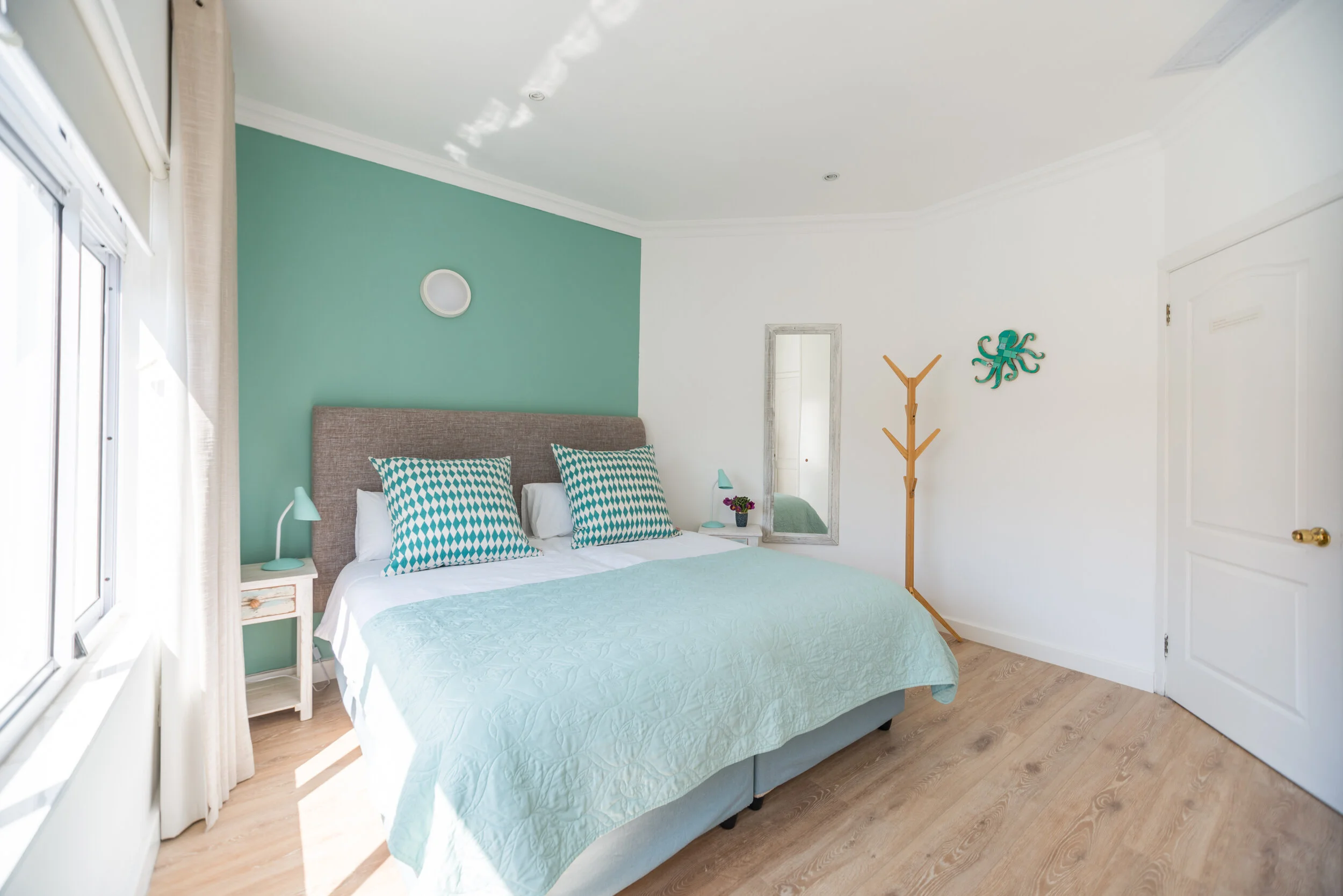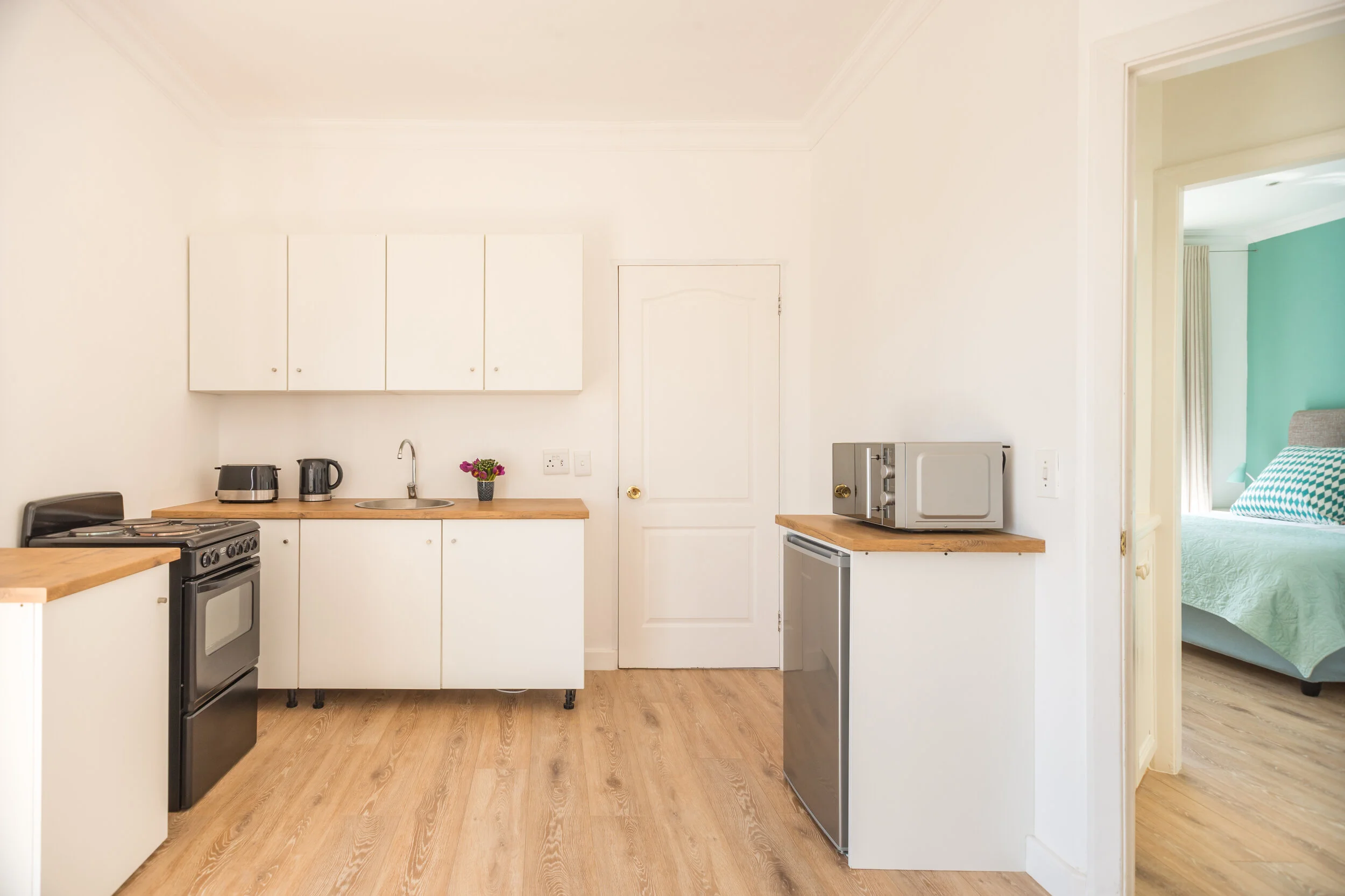 35 m², Selbstversorger-Zweizimmerwohnung im ersten Stock, für 2-3 Personen, Holzbalkon mit Meer- und Gartenblick, Wohnzimmer mit kleiner funktionaler Küche und Schlafsofa, ein Schlafzimmer mit Kingsize-Bett, eigenes Badezimmer
